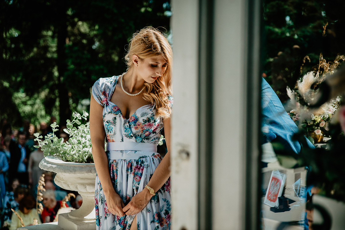 Akompaniament kwartetu skrzypkowego i cudownej oprawy kwiatowej wzmagał tylko efekt niecodziennego wydarzenia, w którym dwoje naprawdę szaleńczo Zakochanych, zaraz powie sobie ‘tak’ – już do końca. I tu nagle pojawia się Ona, z charakterystycznym sobie wiatrem we włosach i … bez białej sukni, bez welonu, bez ciągnącego się 3 metry trenu. Iza. Właśnie taka stylizacja pasowała do niej w Dzień Ślubu najlepiej. Obok mężczyzna w jasnym garniturze z nieprzesadzoną elegancją, jak na te okoliczności przystało. Było perfekcyjnie niesztampowo, i to uwielbiam! Potem przemowa Mamy, przez którą łzy spływały mi po policzkach zza aparatu, a był całkiem dobrym kamuflażem! Emocje udzieliły się nie tylko mnie, ale wszystkim gościom, którzy chłonęli tę chwilę jak tylko mogli.